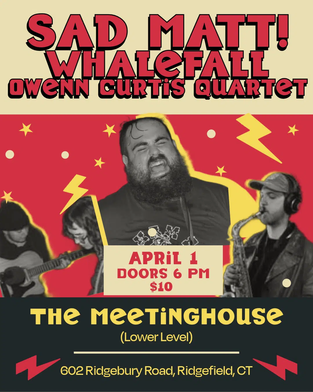 Live music in the Meetinghouse’s Lower Level! Featuring an eclectic lineup of acoustic singer songwriters Whalefall and Sad Matt, alongside live jazz from Owenn Curtis’ Quartet! Doors at 6, music at 7pm. All ages.