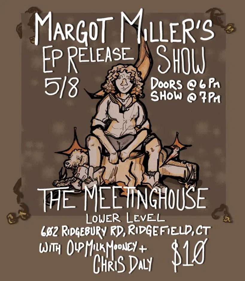 Stop by the Meetinghouse on Friday, 5/8 to experience the live release of Margot Miller’s brand new EP! Doors at 6, music at 7. Featuring performances by Old Milk Mooney and Chris Daly.