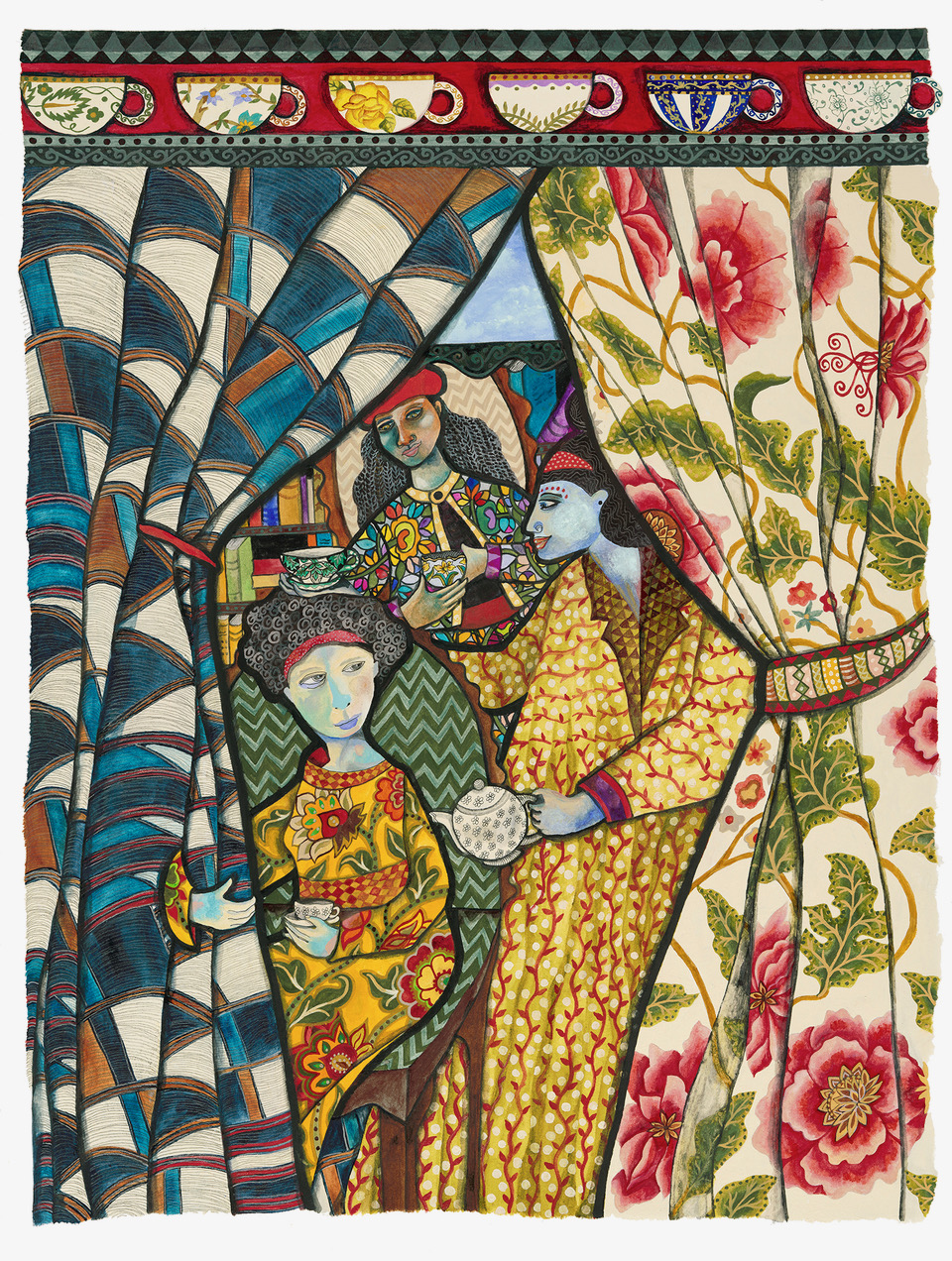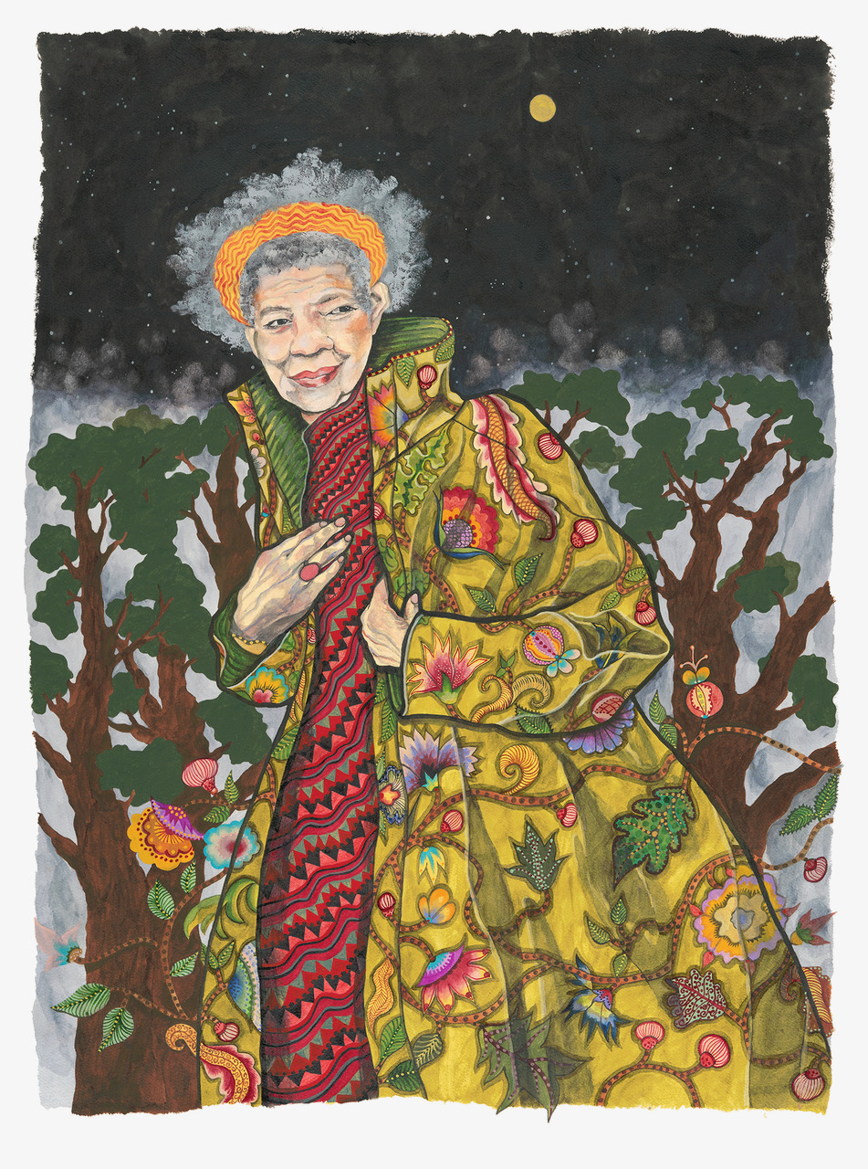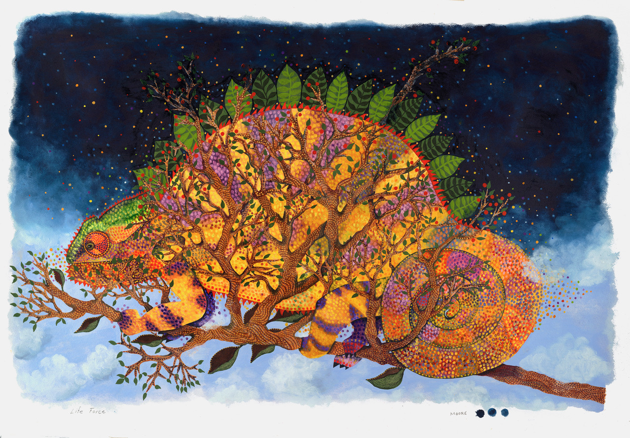 As time passed, Moore’s chameleons began sporting women’s heads and hands, eventually becoming fully realized women. This direction led to her ongoing series of “Unconventional Women.” According to Moore: “I feel like I’ve tapped into a rich vein of material that I’ll be mining for a long time to come. These women keep appearing in my head, whispering to my heart, and dancing onto the paper—I’m trying my best to keep up with them. At this point, I feel like I’m creating the community of women I want to be surrounded with.” The artist also continues to paint animals and botanica, and returning to that well of inspiration is an act of renewal for her.