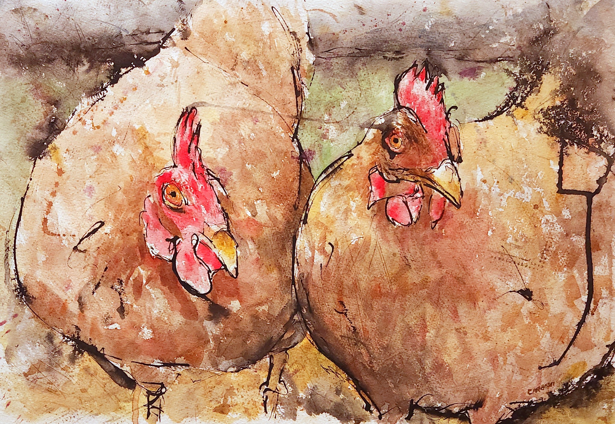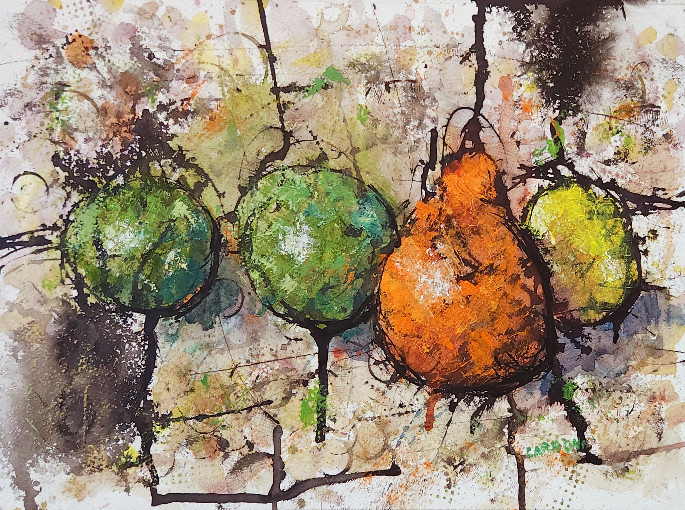 When working in watercolor I start each piece with an ink drawing using an eyedropper. Colors are applied with a brush and manipulated with various items found in the studio. When painting in oil, a palette knife is used. This keeps the painting vibrant with color and expressive with emotion.