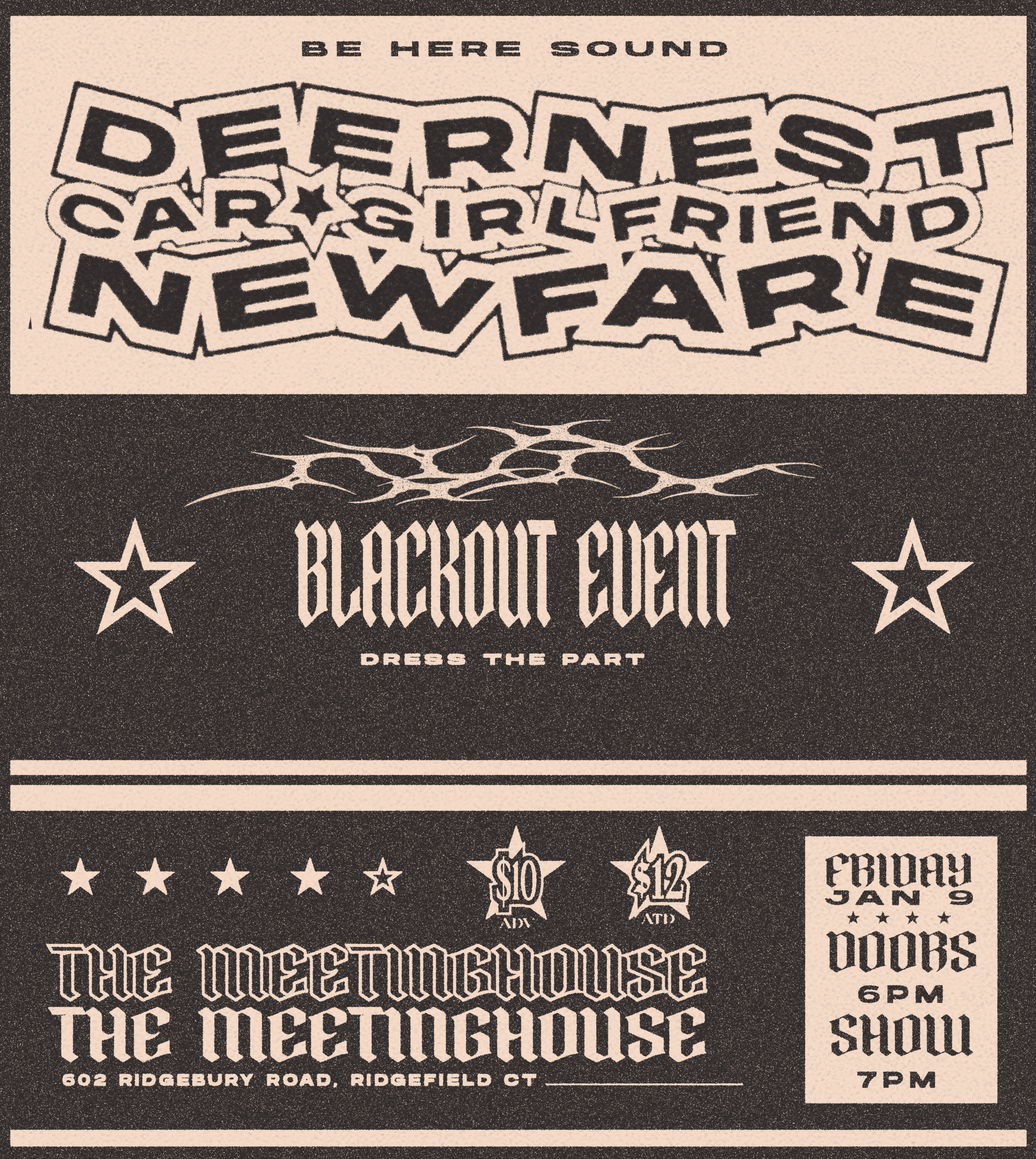 Join us for live Music at The Meetinghouse! Friday, January 9, 2026 6:00 pm - 10:00 pm Be Here Sound presents: Deernest - New Milford Alt Rock / Grunge! Car Girlfriend - Alt / Punk from Providence! Newfare - New Rock & Roll from Danbury CT! Blackout event: Dress the part! Doors at 6pm, show […]