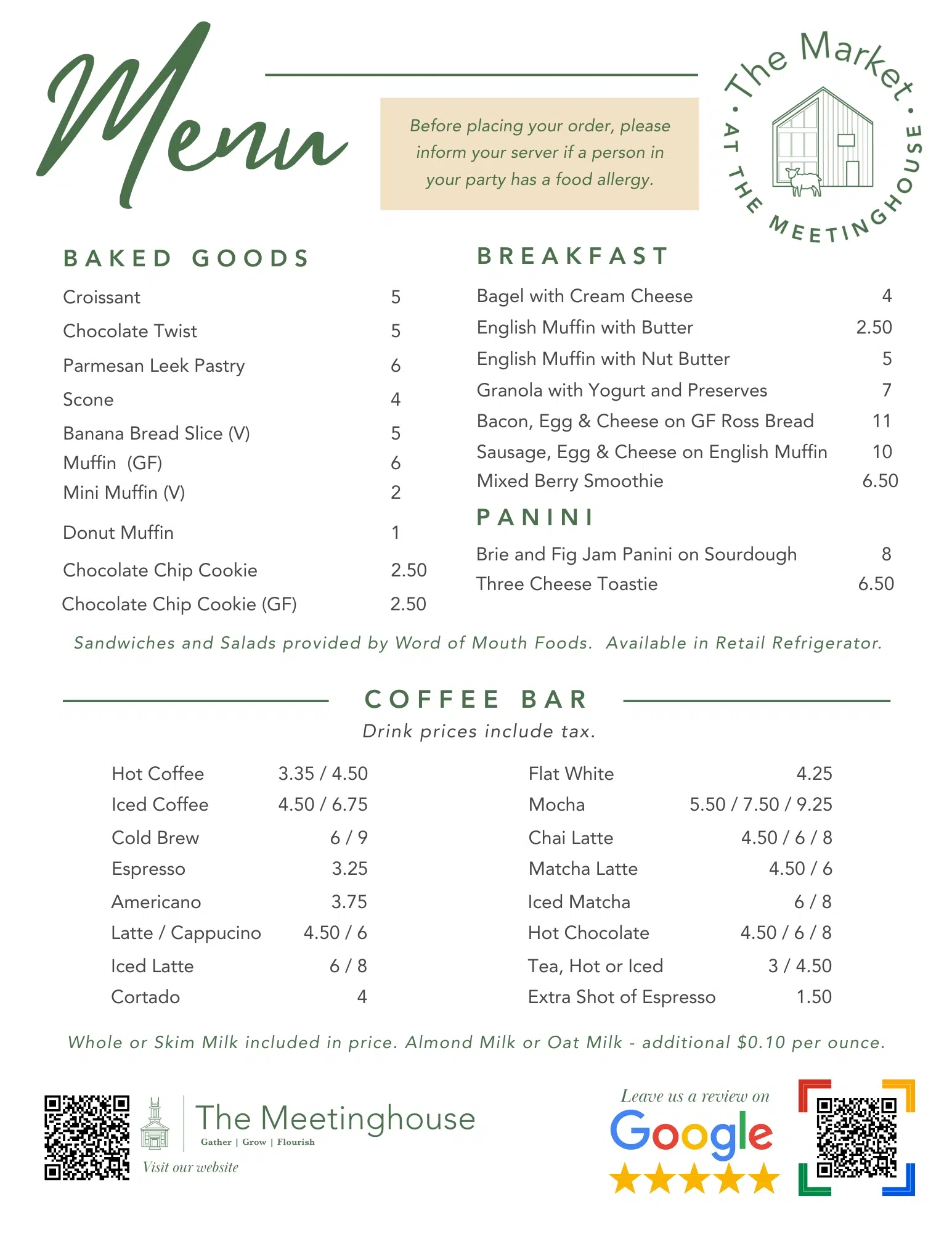 Our operating hours accommodate The Meetinghouse activities as well as the needs of anyone who passes through our neighborhood: morning and evening commuters, local workers on lunch break, and weekend explorers from afar.